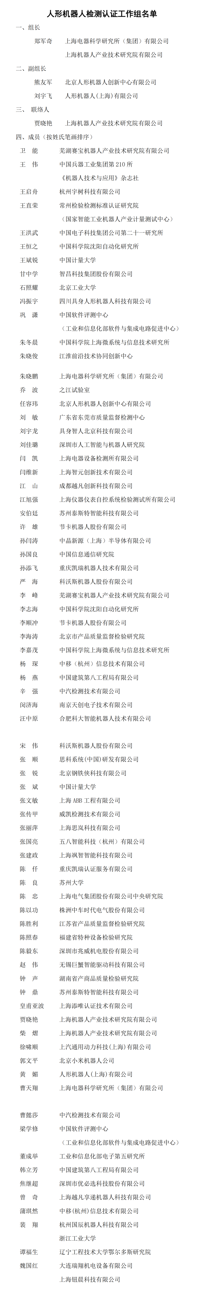 工作组目前有77位专家,来自64个单位,国家机器人检测与评定中心(总部)主任、银河集团(galaxy)(集团)机器人有限公司官网院长郑军奇任工作组组长,北京人形机器人创新中心有限公司总经理熊友军和国家地方共建人形机器人创新中心技术总监刘宇飞任副组长。