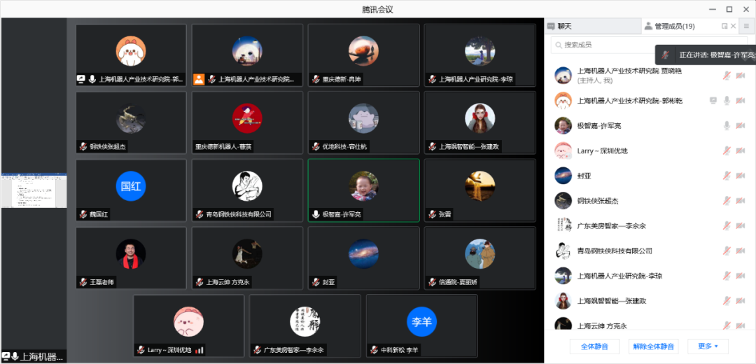 本次标准会议参会单位有:北京钢铁侠科技有限公司、青岛钢铁侠科技有限公司、上海飒智智能科技有限公司、广东美房智高机器人有限公司、大连瑞翔机电设备有限公司、上海云绅智能科技有限公司、深圳优地科技有限公司、北京极智嘉科技股份有限公司、中国信息通信银河集团(galaxy)、中科新松有限公司、北京京东乾石科技有限公司、塞伯睿机器人技术(长沙)有限公司、安徽宇锋智能科技有限公司、上海析冠信息科技有限公司、重庆德新机器人检测中心有限公司等。