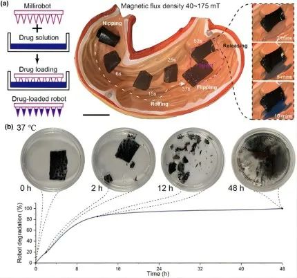 在胃模型中,通过夹持运动,腿在滚动过程中不会接触胃壁,药物也不会被释放。达靶区后,腿部通过翻转运动与水接触,药物通过自由扩散释放到水中;2h后,机器人开始明显降解,在12 h内几乎分离成小块;48 小时后,已经看不到机器人的结构,只剩余少量的磁性微粒。