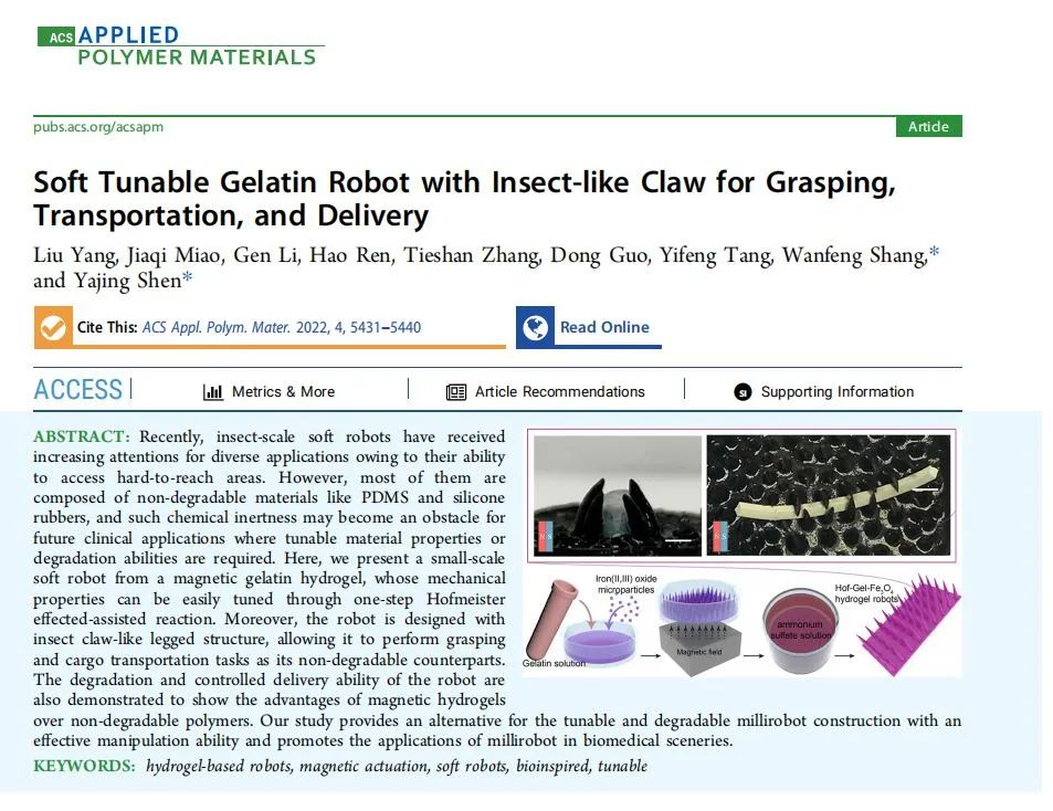 这篇文章发表在《ACS Applied Polymer Materials》(ACS应用高分子材料) 期刊上,文章标题为“Soft Tunable Gelatin Robot with Insect-like Claw for Grasping,Transportation, and Delivery”。