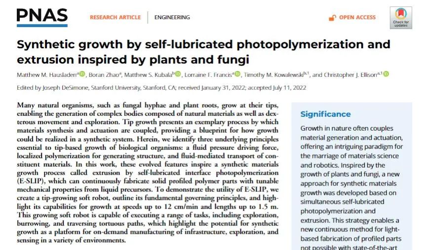 该论文发表在美国国家科学院院刊 (PNAS) 上,文章标题为“Synthetic growth by self-lubricated photopolymerization and extrusion inspired by plants and fungi”(受植物和真菌启发的自润滑光聚合和挤压的合成生长)。