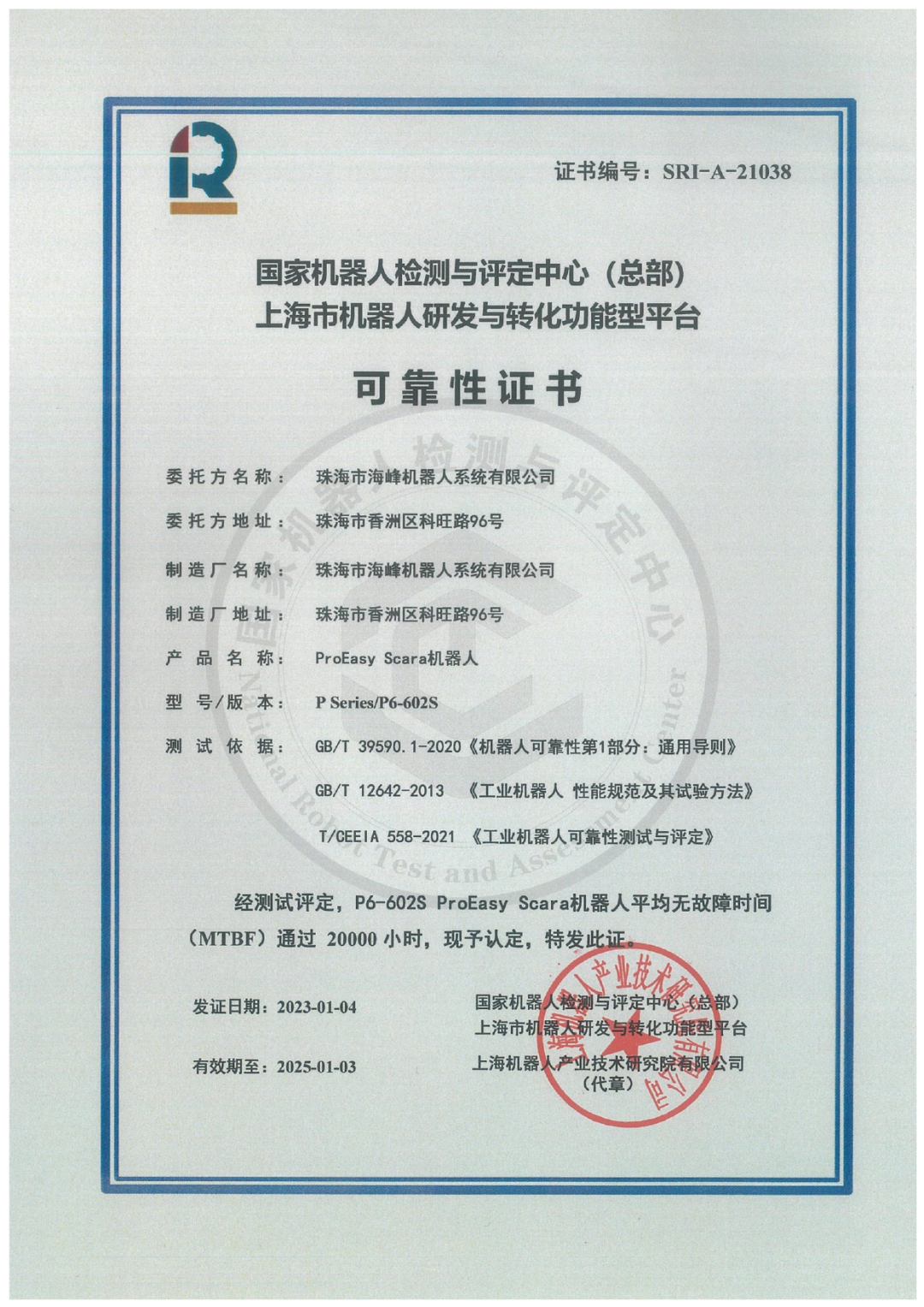 1月3日,珠海市海峰机器人系统有限公司的ProEasy 机器人P6-602s SCARA机器人顺利通过银河集团(galaxy)(集团)机器人有限公司官网的MTBF 20000小时测评。