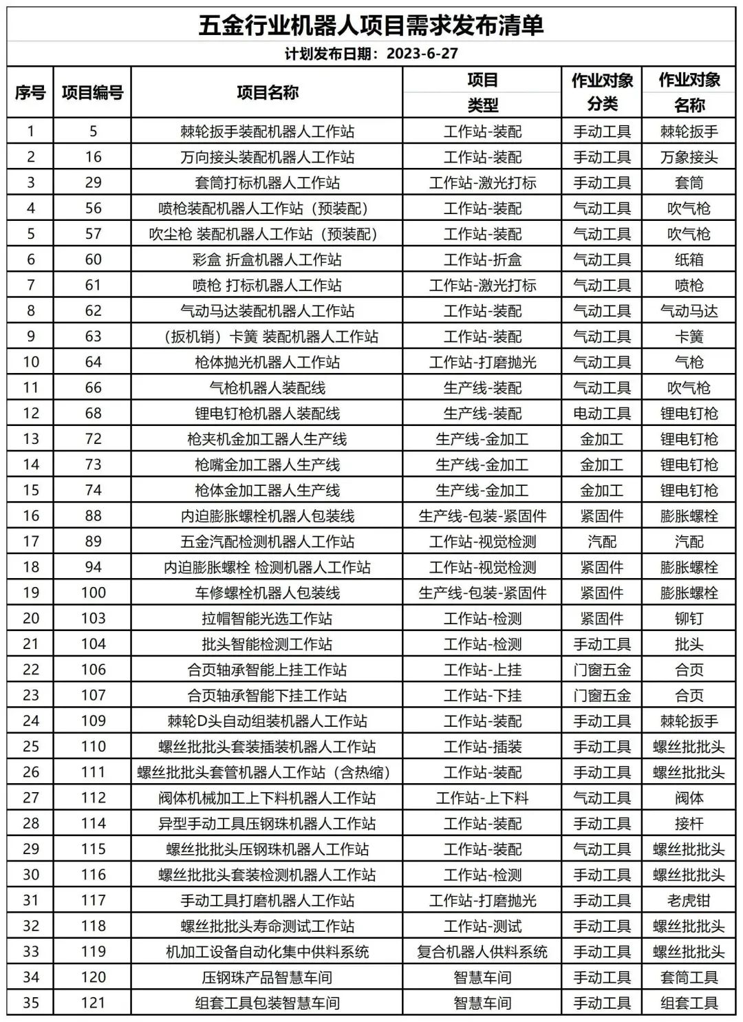 加快推进五金行业机器人项目、产业链内循环及生态体系建设,促进“机器人+五金”从应用需求到供应链需求一体化协同发展,电科云汇机器人应用创新服务平台拟定于2023年6月26日至6月28日在宁波佳尔灵气动机械有限公司召开五金行业机器人项目需求发布暨“机器人+五金”协同开发生态体系建设研讨会。拟发布35项五金行业机器人需求项目,并就协同开发生态体系与行业优质企业达成内循环多循环战略,进行端到端服务,不仅适应当下商业发展的规律和特点,也符合未来的经济格局和发展需求。现将有关事项通知如下: