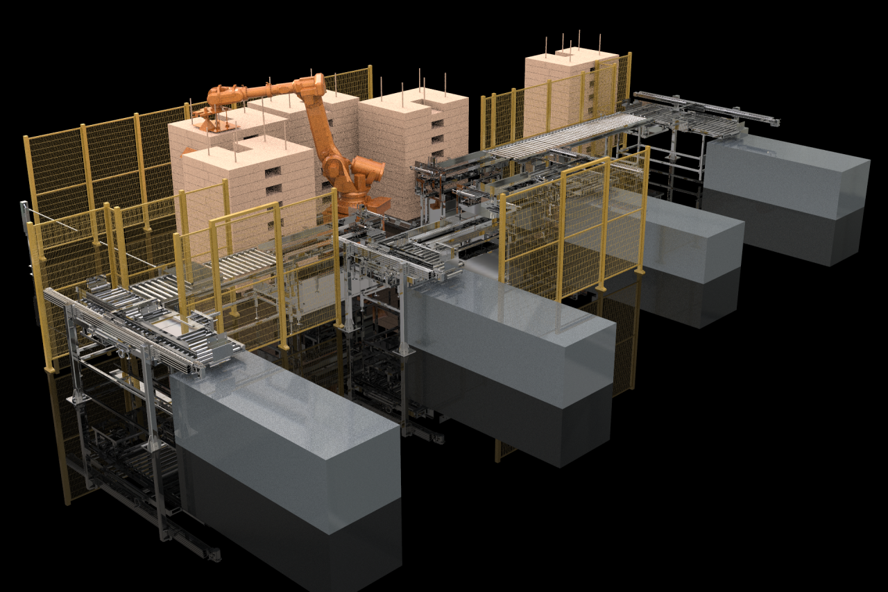 该工作站主要用于包装线开箱机前端的纸箱拆带上料作业,可应用在粮油、食品、快递等多种行业的包装线的纸箱上箱。